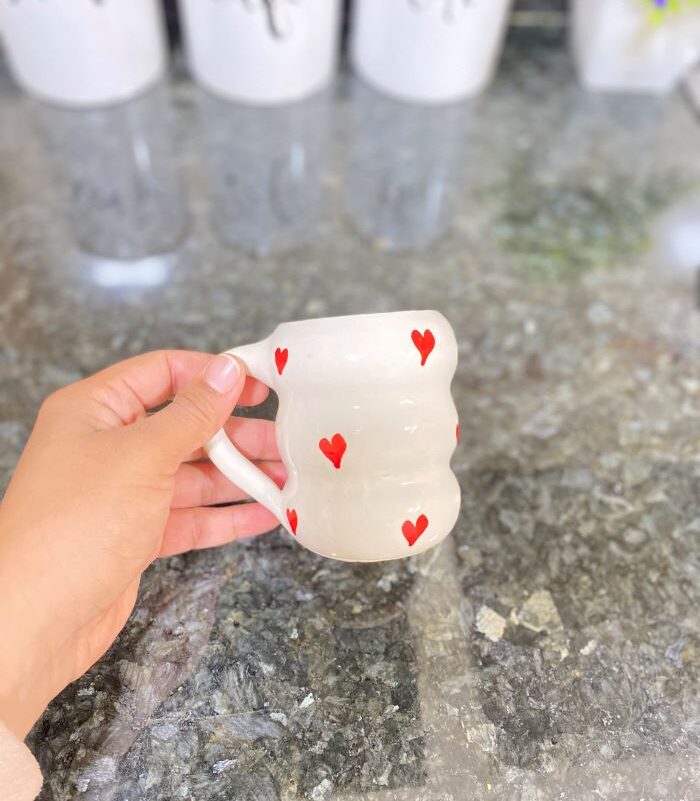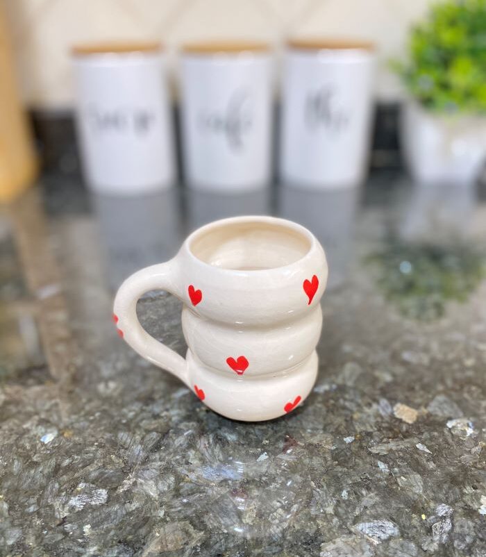 Son design ondulé et ses petits cœurs rouges peints à la main en font un mug unique,