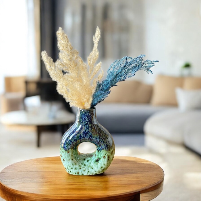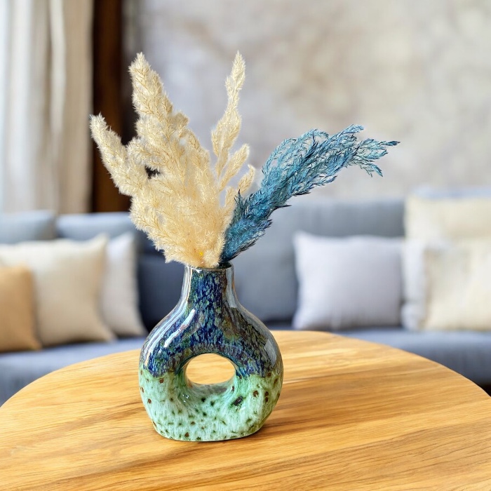 Le Vase Donut Émeraude associe une forme iconique et des couleurs vibrantes pour sublimer ton intérieur. Une pièce artisanale unique et élégante.
